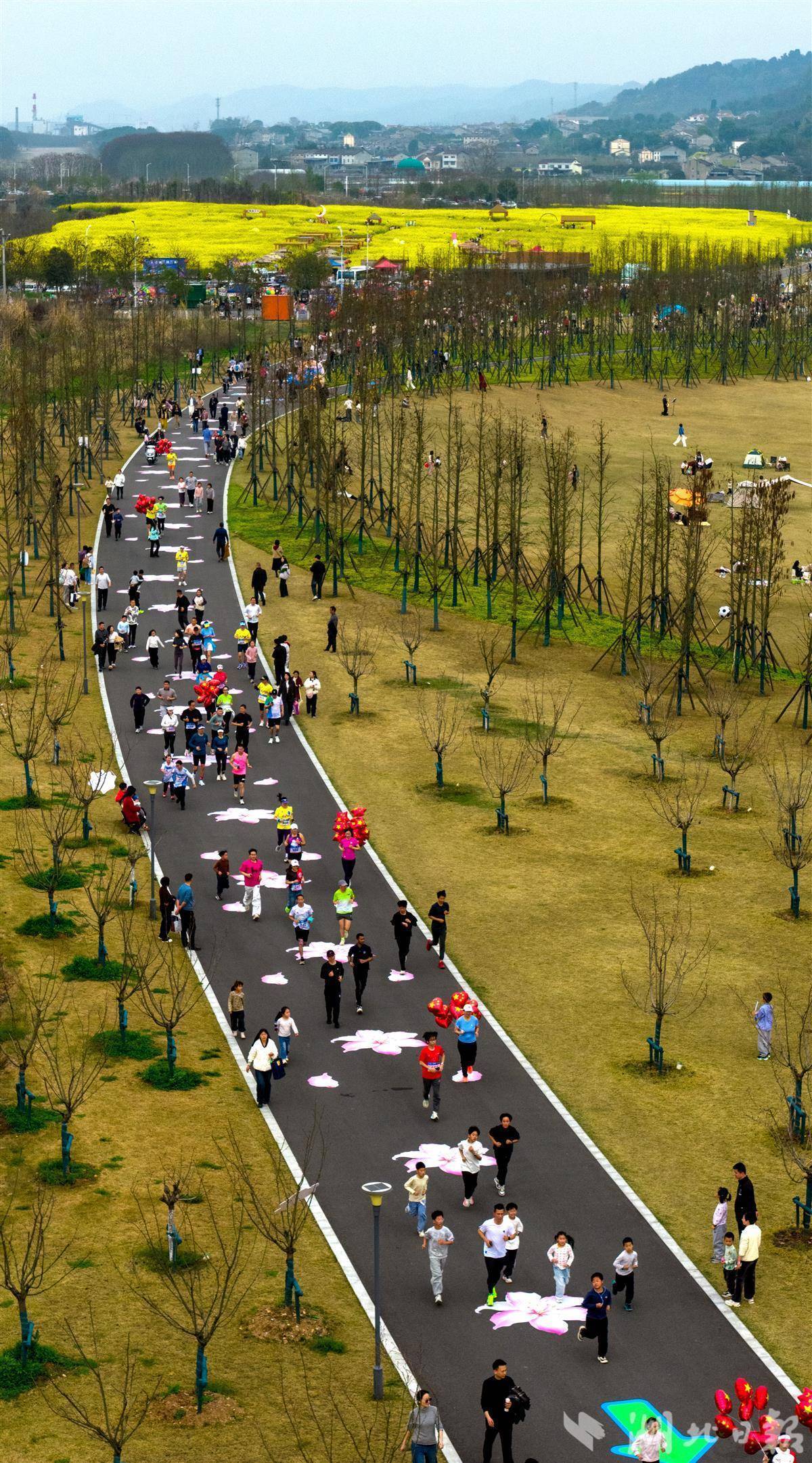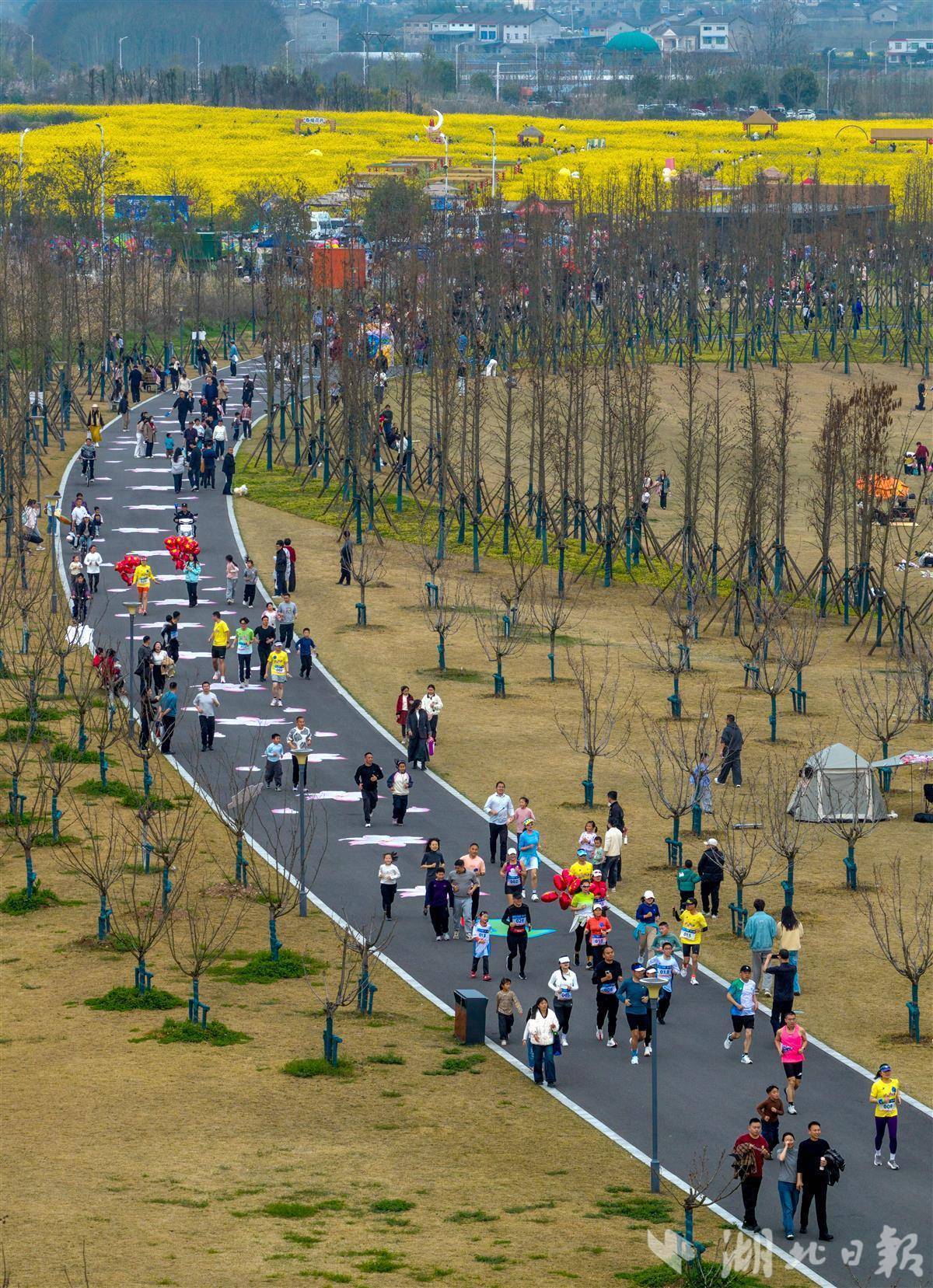 本次接力跑赛道全长7.8公里,路线设计贴合宜昌生态与人文特色,从站东路出发,经迎客路驶入柏临河生态廊道,最终抵达柏临河湿地公园,既符合专业赛事安全、舒适的要求,又能让跑者穿行于金色油菜花海与湿地绿意之间,沉浸式感受宜昌的春日之美与生态魅力,这种设计既彰显了宜昌的自然禀赋,也实现了“跑风景”与“看城市”的双重目标。(湖北日报全媒记者 刘曙松 摄)